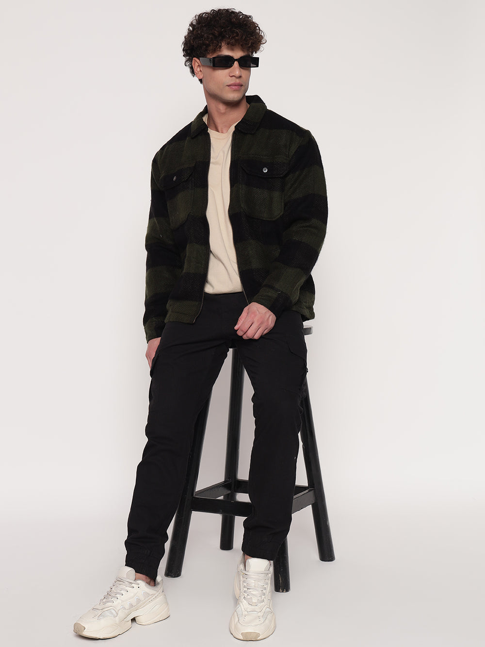 MEN'S GREEN BLACK ZIPPER DROP SHOULDER SHACKETS